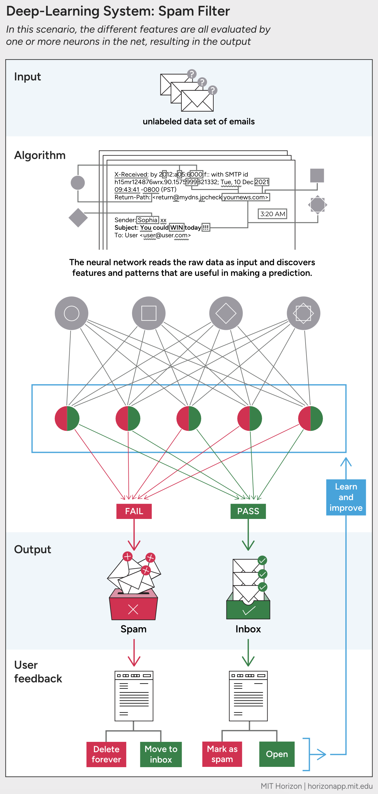A spam filter trained by machine learning can catch spam that humans might not—by finding subtler patterns among more emails than a human developer would (or could) code for. Machine learning also allows a spam filter to adapt to changing circumstances, to keep up with spammer tactics, and to personalize its decisions for a particular inbox, based on feedback. Such a system might consider thousands of variables in a single email.